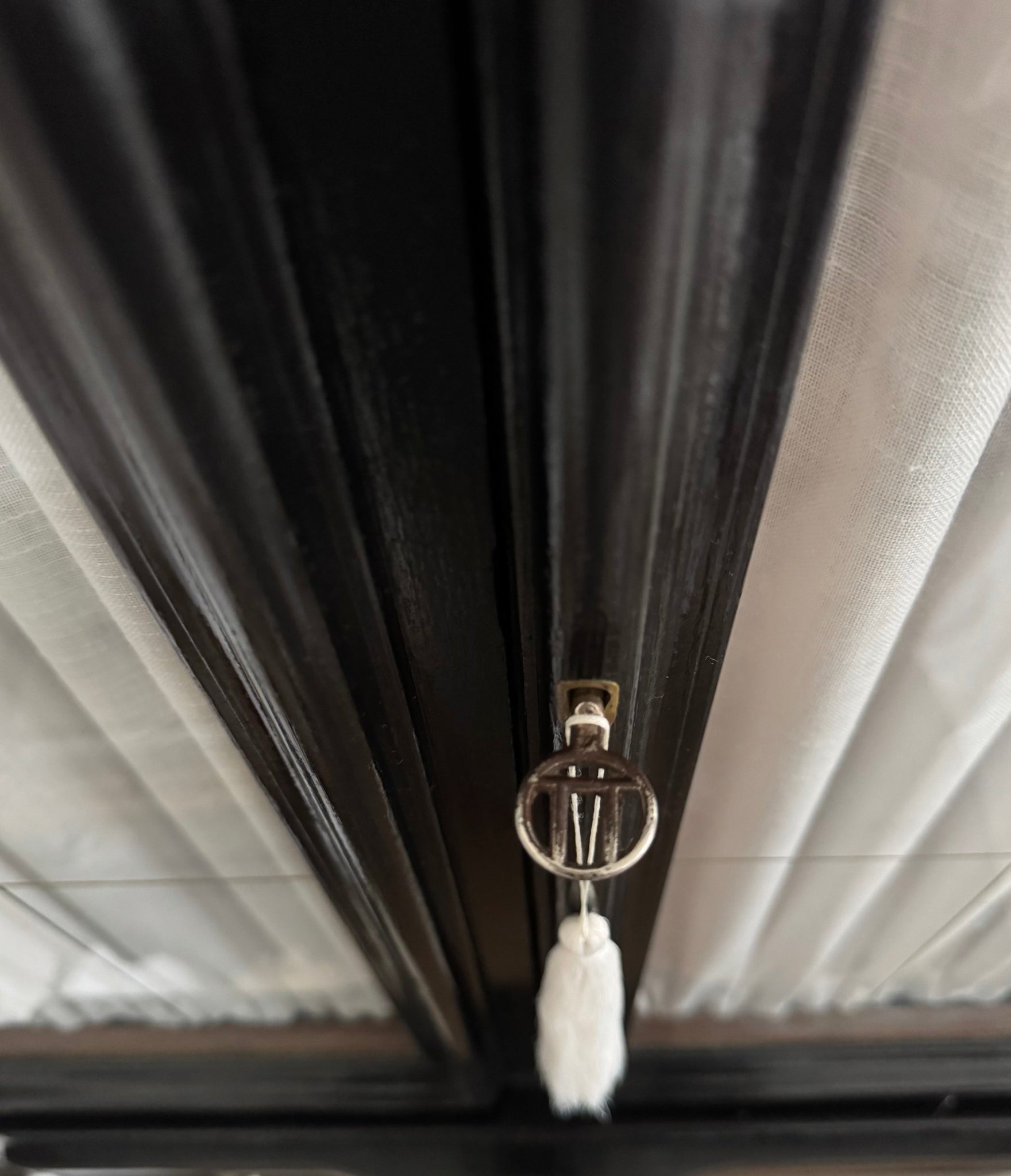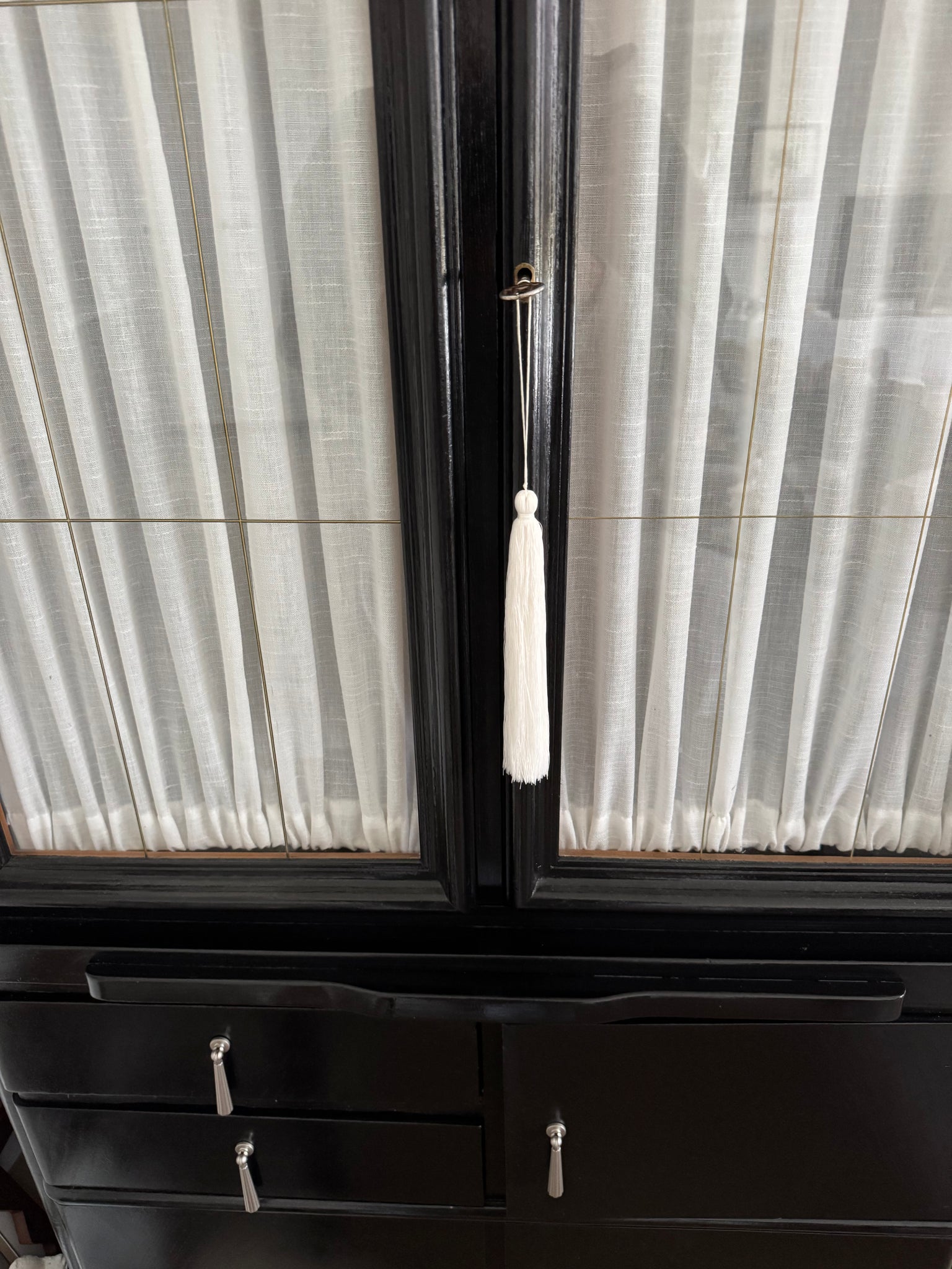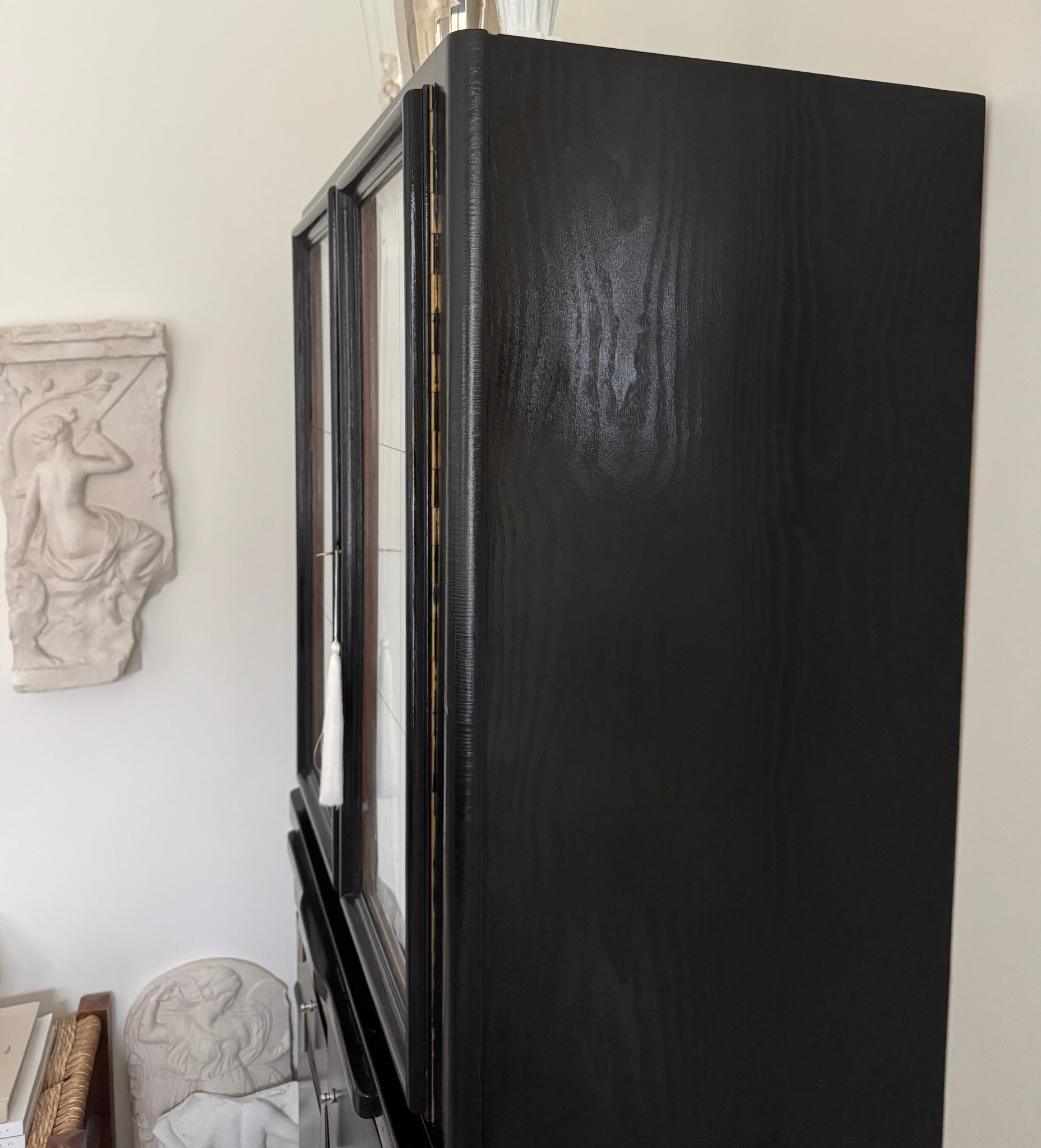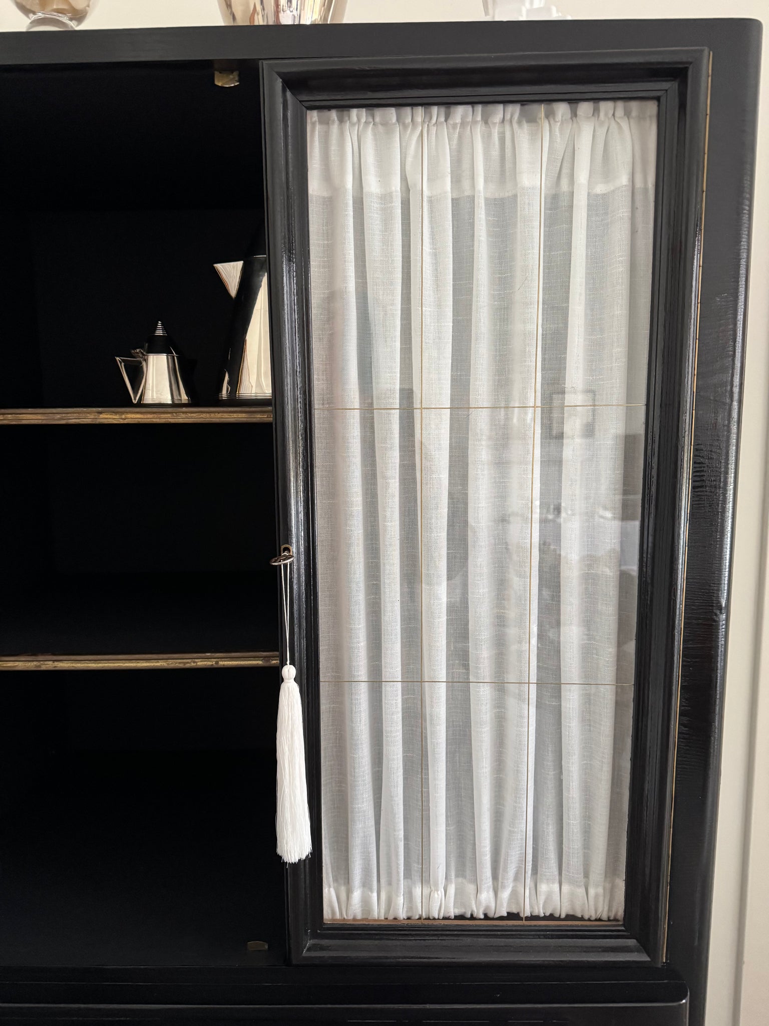 Its glossy black lacquer highlights the subtle beauty of the visible wood grain. This exquisitely crafted, high-quality solid wood piece captivates with elegant brass details on the shelves and the base.